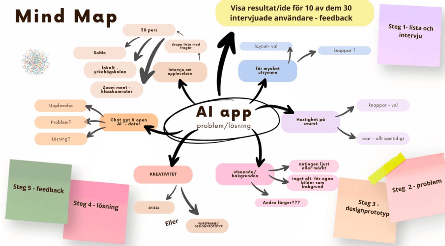 För att identifiera de mest framträdande problemen behövdes insikter direkt från målgruppen. Intervjuer och samtal genomfördes med 30 personer bestående av studenter, yrkesverksamma inom teknik och utbildning samt personer som använder AI-verktyg i sitt dagliga arbete. Svaren analyserades och kategoriserades utifrån användarnas tekniska kunskaper, användningsfrekvens och syfte med verktyget. Genom denna analys framkom tre återkommande problemområden :