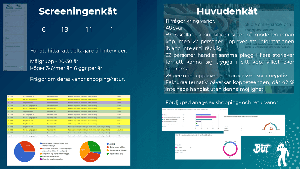Screening-enkät : Screening-enkäten fångade vår målgrupp genom frågor om ålder, shoppingvanor och retur. Av 24 svar sorterade vi bort de som inte passade, vilket gav 13 personer. 11 av dessa kontaktades för intervju och en tackade ja via enkäten. Resultatet visade att de flesta handlar mer än 3–6 gånger per år, och de flesta returnerar på grund av att storlekarna inte passar.