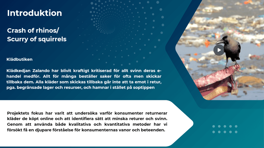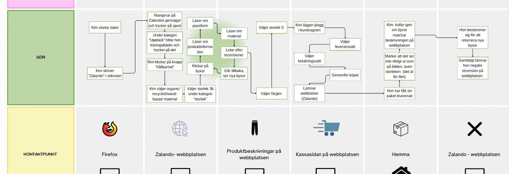 Syfte och mål : Studien syftar till att förstå varför målgruppen, främst 20–30-åringar, returnerar kläder de köpt online, samt de bakomliggande orsakerna till detta beteende. Utifrån insikterna ska kundresor och personas skapas för att kunna optimera användarupplevelsen och minska svinn.