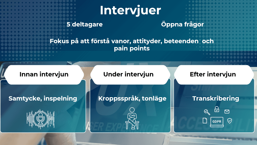 I projektet använde vi en kombination av enkäter, intervjuer och guerilla-metoden för att hitta deltagare till intervjuer.