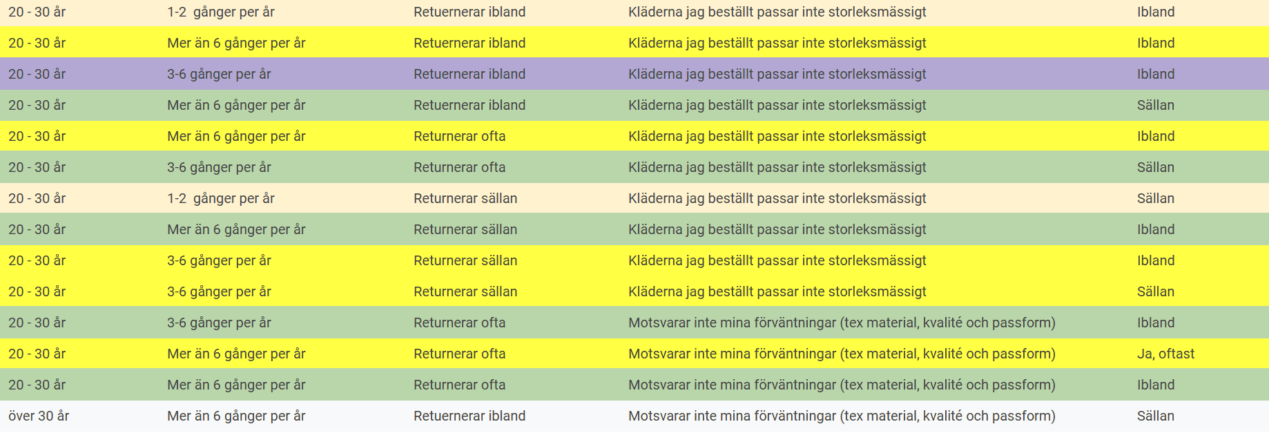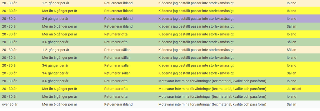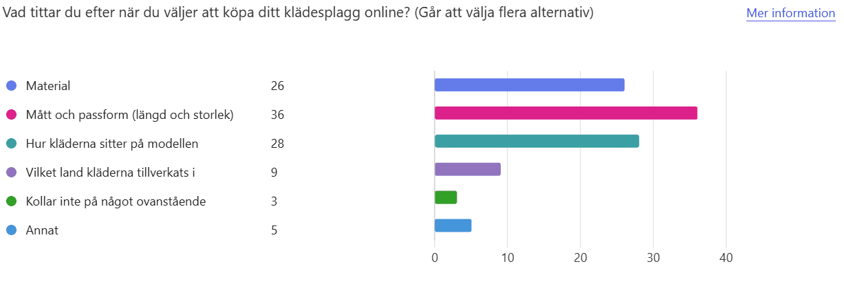 19 personer hade en negativ upplevelse av att handla online, 9 positiv och 20 neutral. Konsumenter tittar mest på material, mått och passform. Majoriteten upplevde att informationen på hemsidan finns men att den inte alltid är tillräcklig för att känna sig säker på köpet. 22 personer köper samma plagg i flera storlekar, och 29 upplever returprocessen negativt.