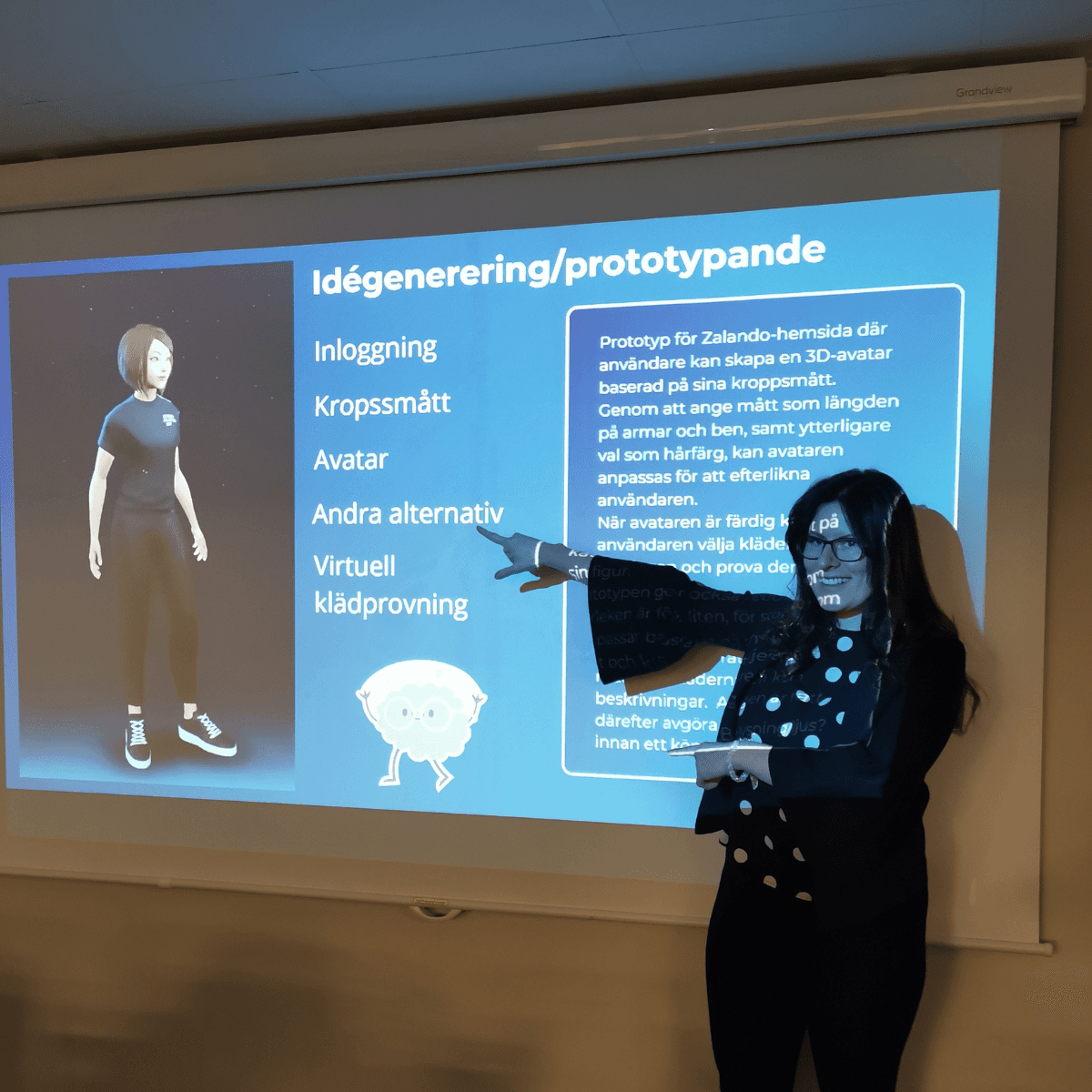 Nästa steg var brainstorming av olika idéer och en lösning utvecklades i form av en 3D-avatar för Zalando. Prototypen låter användare skapa en digital figur baserad på sina kroppsmått, där mått som armar, ben och andra dimensioner kan anges, och ytterligare val som hårfärg gör att avataren kan efterlikna användaren. När avataren är färdig kan användaren prova kläder virtuellt direkt från katalogen. Systemet ger även feedback på passform, om plagget är för stort, för litet eller om det passar, baserat på användarens mått och klädernas detaljerade beskrivningar. Detta gör det möjligt för användaren att fatta ett mer informerat beslut innan köp och minskar risken för returer.